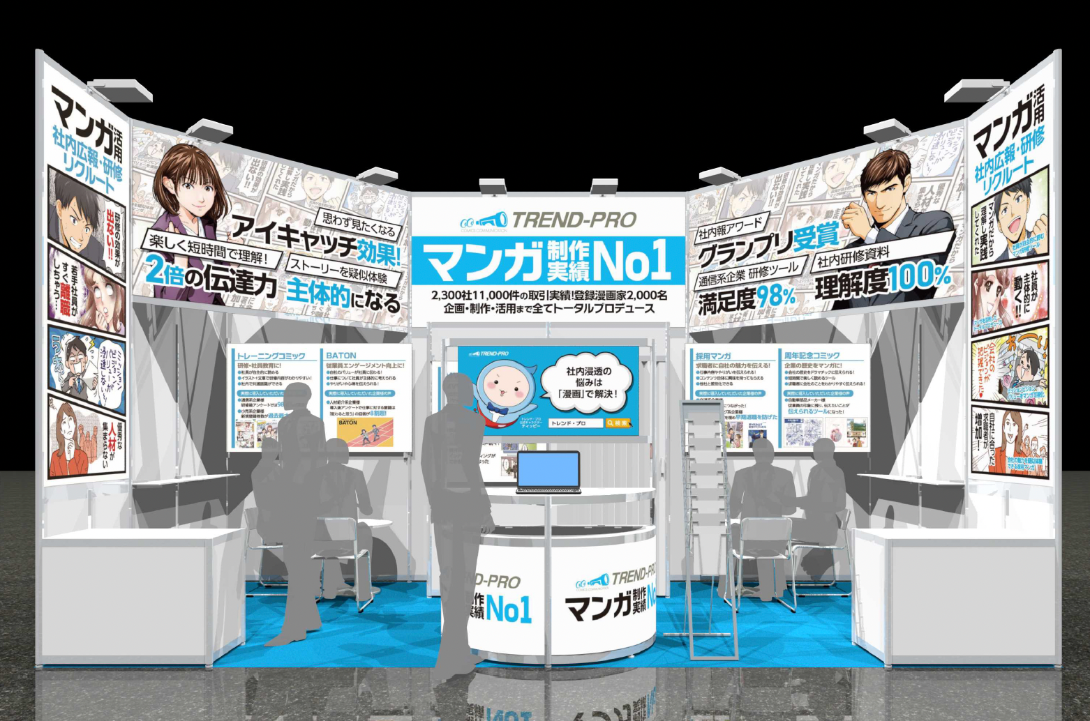 人事課題を解決する「トレーニングコミック」「BATON」「MVVコミック」「周年記念コミック」「採用マンガ」の5つのサービスをブース内でご紹介しています。それぞれの活用事例もご用意しており、実物をお手にとってご覧いただけます。また、お打ち合わせをお約束いただいた方には、トレンド・プロにて制作したビジネスコミック『まんがでわかる 伝え方が9割』『ザ・ゴール コミック版』『まんがでわかる 頭に来てもアホとは戦うな!』『マンガ 最高の戦略教科書 孫子』『ねえ、ぴよちゃん(1)』のうちからお好きなもの1冊をプレゼントいたします。