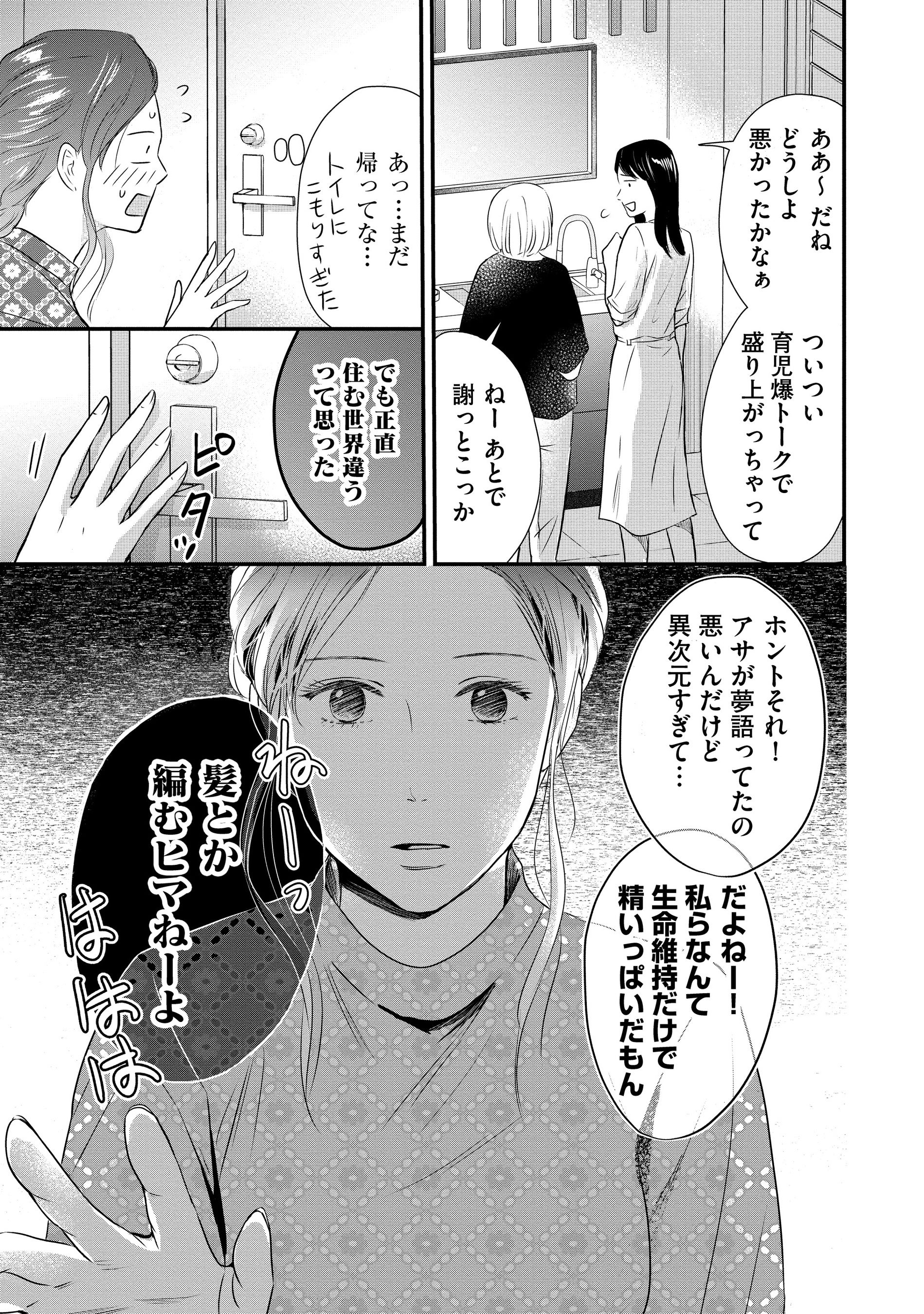 子持ちの同級生らの会話についていけず、その上子無しのアサへの陰口も聞いてしまい、居心地の悪い思いをした。