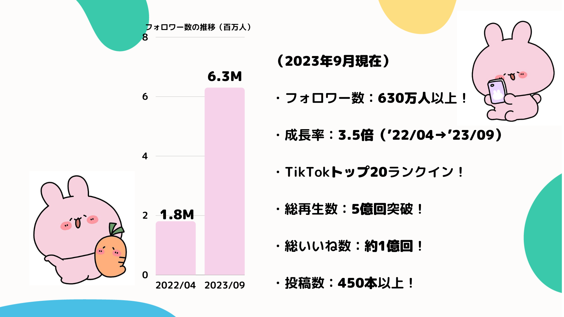 「あなたの気持ちを浅くする寄り添いうさぎ あさみみちゃん」は当社事務所に所属するキャラクタータレントとして、2021年6月にTikTokアカウントを開設し、タレント活動を開始。その後アカウント開設から約10ヶ月で、TikTokマスコットキャラ部門フォロワー数日本一を達成するなど、SNSを中心に活動しています。