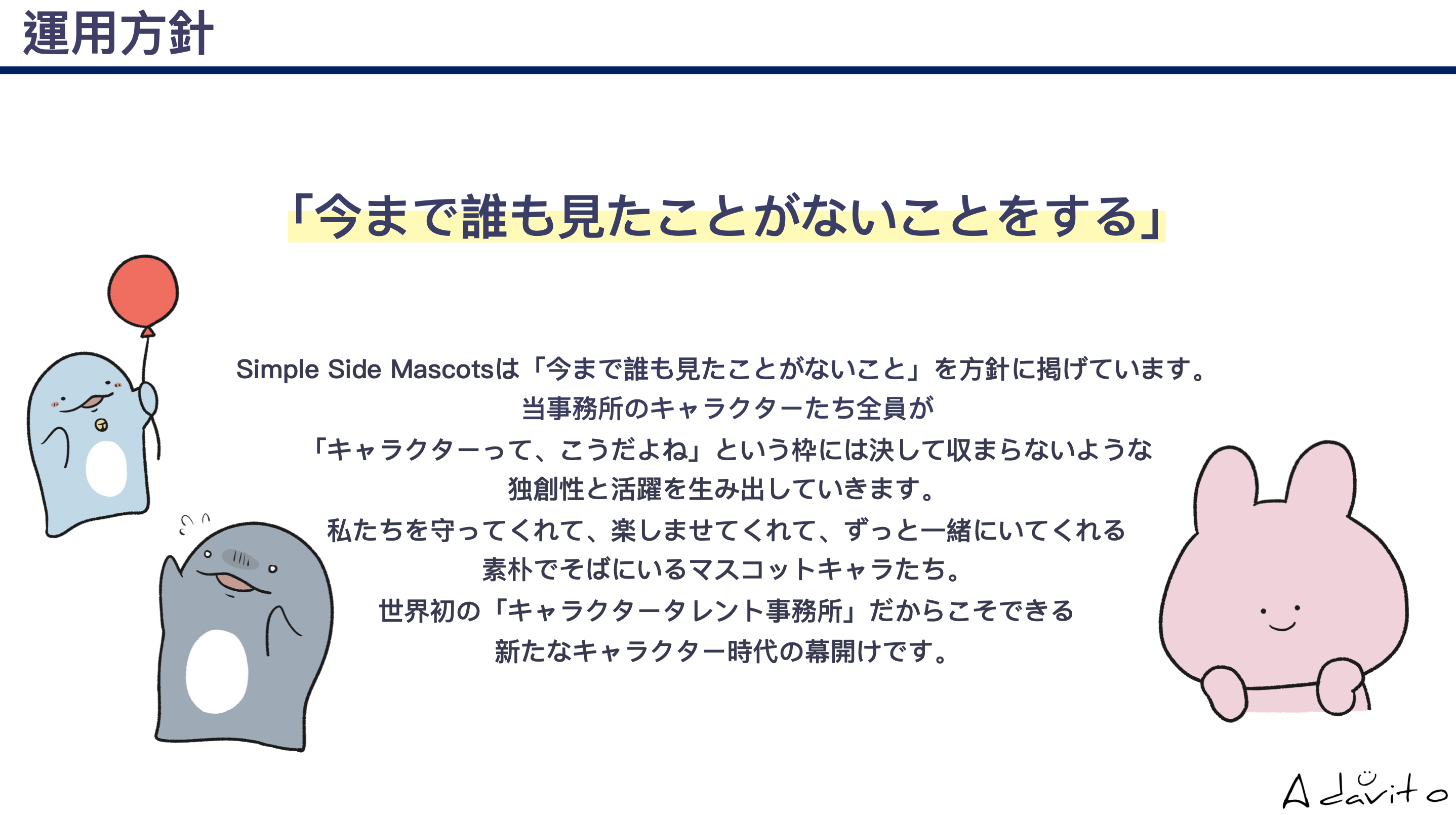 ビジョンである「これからの自分にワクワクできる世の中をつくる」を達成するため、キャラクタータレント事務所「Simple Side Mascots(シンプルサイドマスコッツ)」を運営しています。