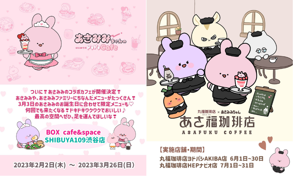 ポップアップショップに続き、あさみみらしさ全開のオリジナルメニューを提供するコラボカフェを開催させていただきました。第1弾は、渋谷109にて「あさみみのはじめてのドキドキカフェ」を2月2日〜3月26日まで期間限定で開店。第2弾では丸福商店様のご協力のもと「あさ福珈琲店」を6月1日〜30日に丸福珈琲アキバ店様、7月1日〜31日 丸福珈琲HEPナビオ店様の、東京と大阪の2店舗で期間限定で開店させていただきました。
