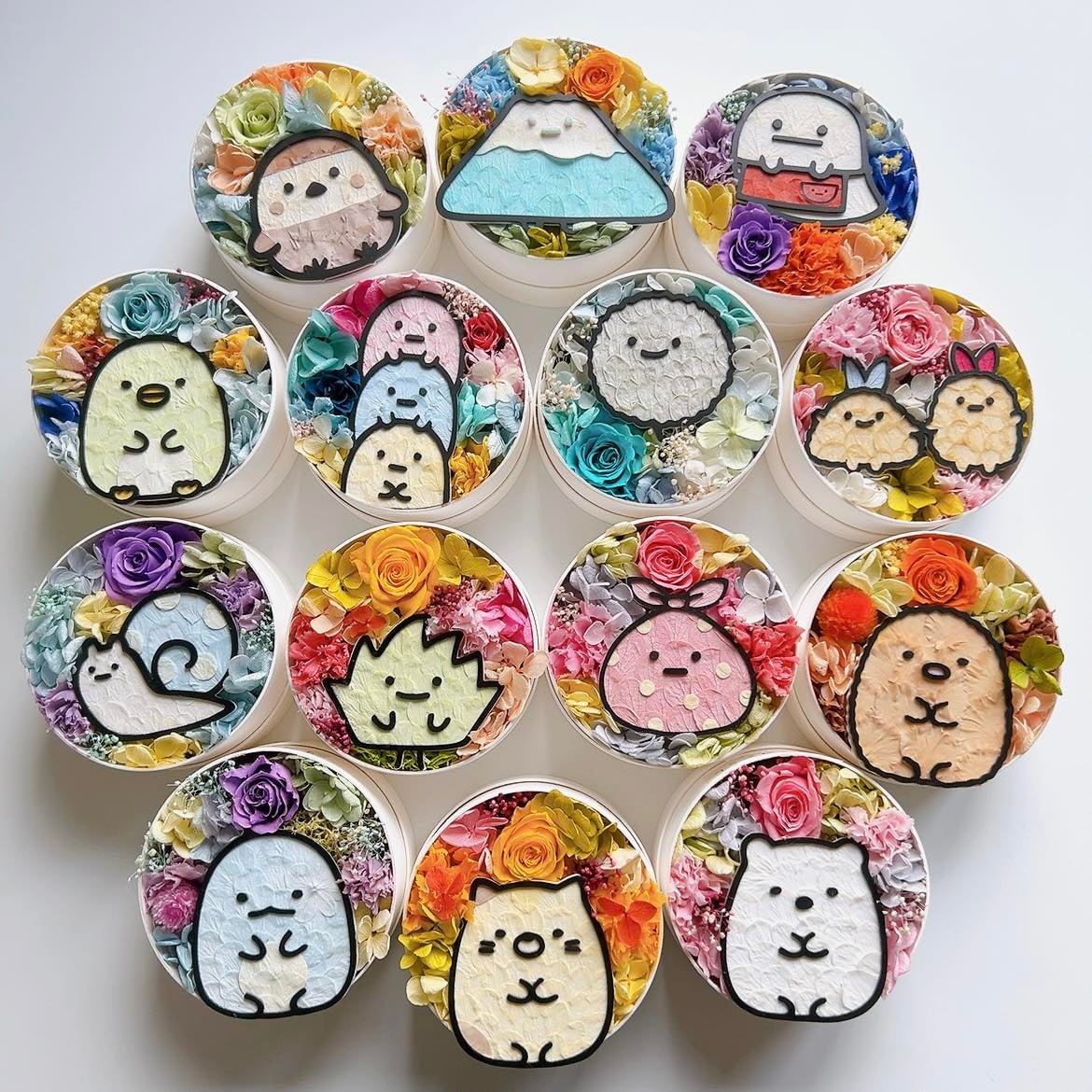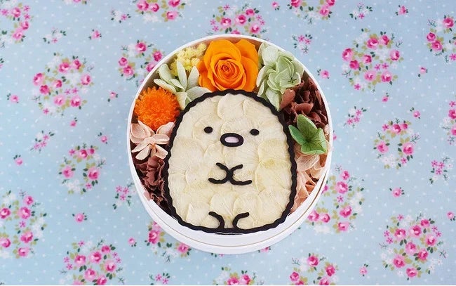 「すみっコぐらし フラワーコレクション」は、バラやかすみ草、あじさい、カーネーションなどのプリザーブドフラワーを使って、すみっコぐらしの仲間たちを描いたフラワーBOX。キャラクターがお花のすみっこにいるような構図が楽しい、コロンとかわいいアレンジメントです。