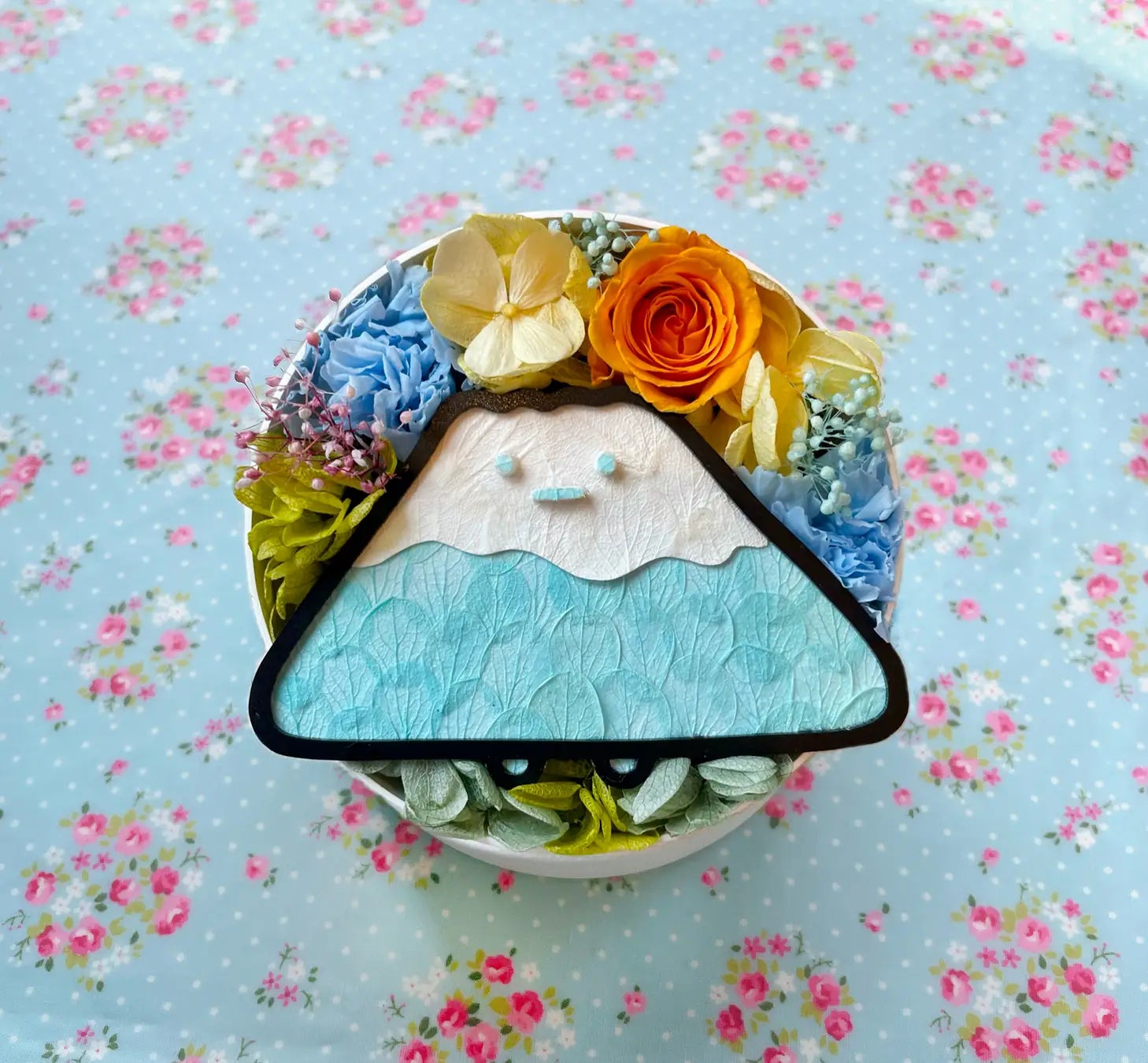 キャラクター部分は、貼り絵のようにあじさいの花びらを一枚ずつ貼り合わせることで表現。プリザーブドフラワーを使っているため水やり不要で枯れずに長持ち。かわいいすみっコたちをずっと愛でることができます。