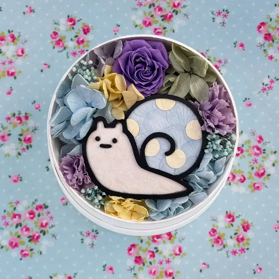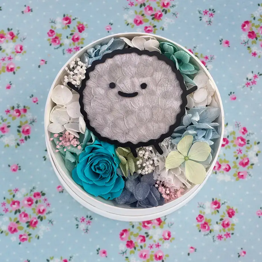 キャラクター部分は、貼り絵のようにあじさいの花びらを一枚ずつ貼り合わせることで表現。プリザーブドフラワーを使っているため水やり不要で枯れずに長持ち。かわいいすみっコたちをずっと愛でることができます。