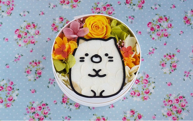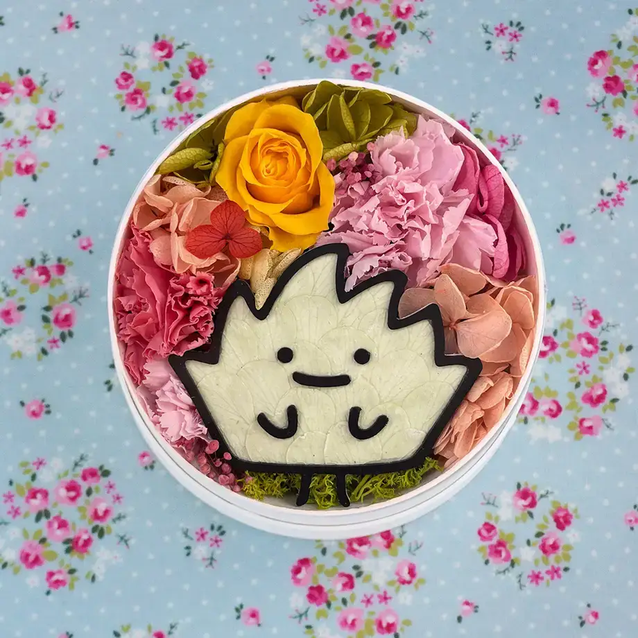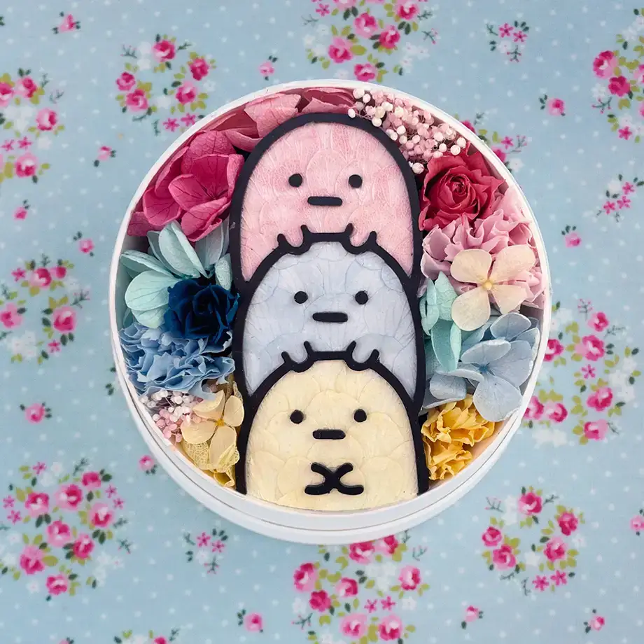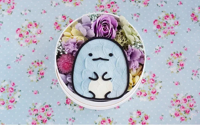 「すみっコぐらし フラワーコレクション」は、バラやかすみ草、あじさい、カーネーションなどのプリザーブドフラワーを使って、すみっコぐらしの仲間たちを描いたフラワーBOX。キャラクターがお花のすみっこにいるような構図が楽しい、コロンとかわいいアレンジメントです。