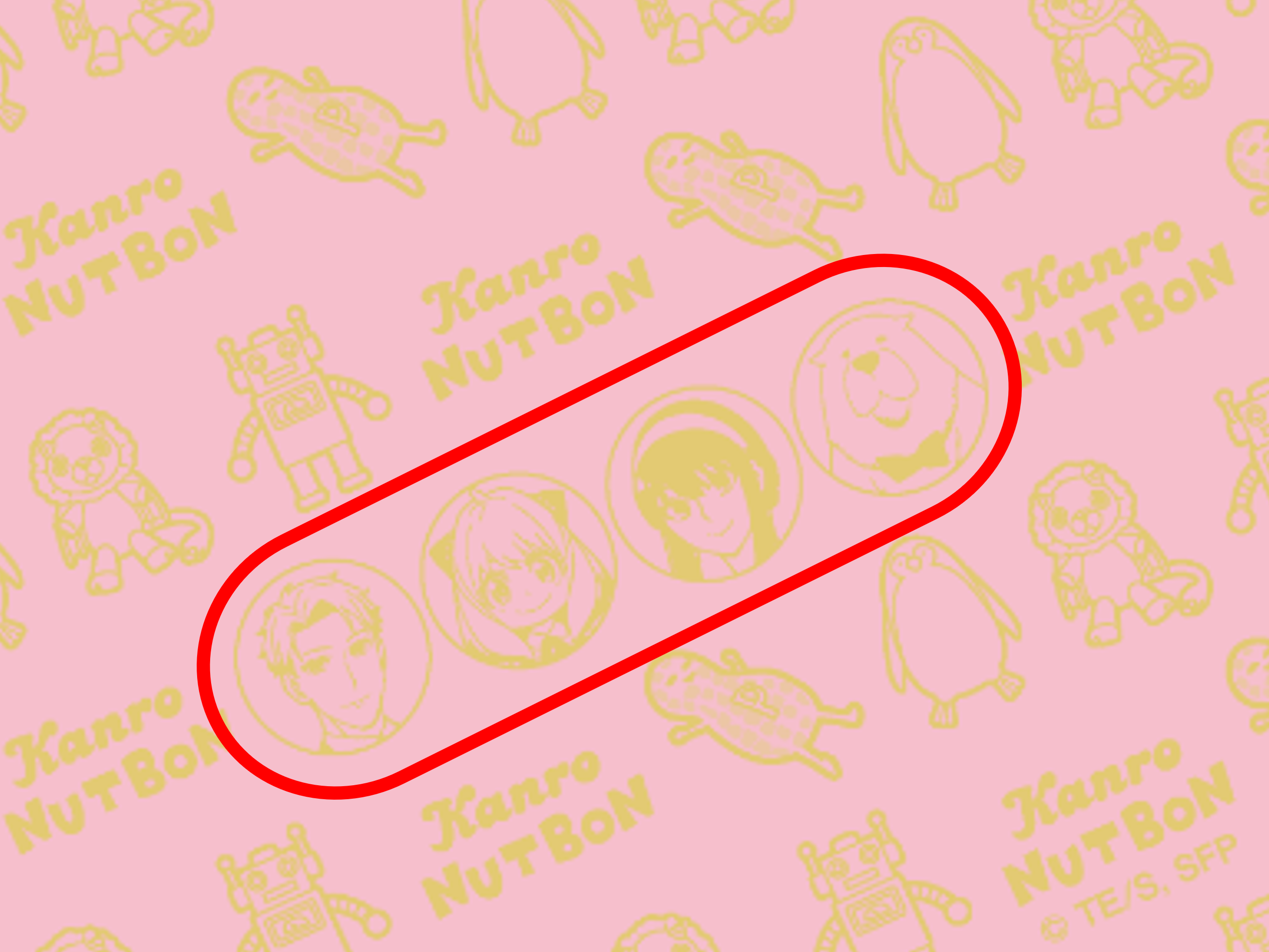 ピーナッツの形をしたキャンディを包む個包装フィルムにも、『SPY×FAMILY』オリジナルデザインならではの仕掛けを用意しました。パッケージにも描かれているアーニャの仲間が散りばめられているほか、フィルムの一部に主人公のフォージャー一家も描かれています。ロイド、アーニャ、ヨル、ボンドの4人全員が並んでいたらミッション成功!? ナッツボンを味わいながら、オリジナルデザインならではの絵柄探しもぜひお楽しみください。