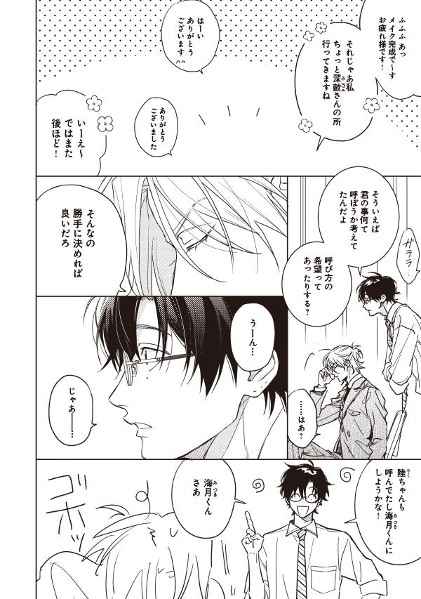 鯛代(たしろ)と瀬賀(せが)のモデル撮影見学に来た蛯原(えびはら)&漫研メンバー。一同、爆イケな二人の姿に大興奮!