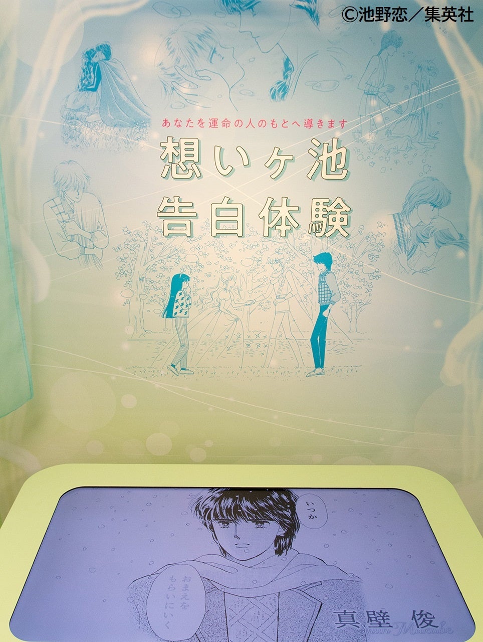 真壁くんのときめきの名シーンを蘭世になりきって撮影できるフォトスポットも登場します。さらに、一番逢いたい人のもとにテレポートできる不思議な池「想いヶ池」が、会場に出現! 想いを込めて想いヶ池を覗き込むと、水面が輝き出し、運命の相手の姿が…。 どの相手から告白を受けられるかはお楽しみ。