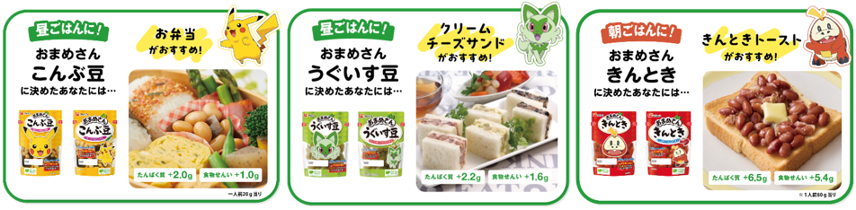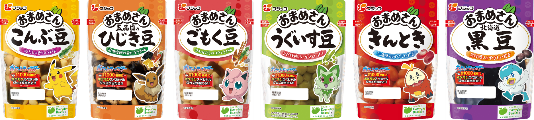 (商品左から)こんぶ豆【ピカチュウ】/五品目のひじき豆【イーブイ】/ごもく豆【プリン】/うぐいす豆【ニャオハ】/きんとき【ホゲータ】/北海道黒豆【クワッス】