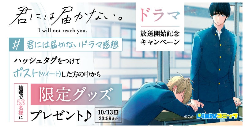 期間中、X(旧Twitter)にて『君には届かない。』のドラマの応援・感想メッセージを専用ハッシュタグ「#君には届かないドラマ感想」をつけて投稿した方の中から、抽選で53名様に、限定グッズや図書カードネットギフトなどが当たります。