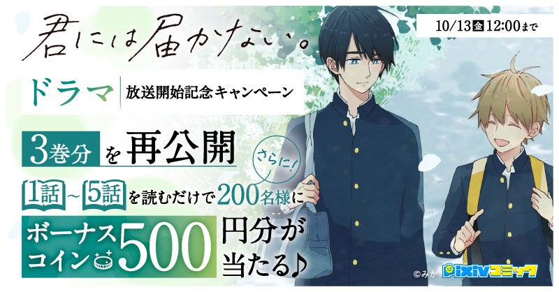 『君には届かない。』の単行本3巻分をpixivコミック内にて期間限定で再公開します。また、期間中に第1話~第5話までを読んだ方の中から抽選で200名様に、pixivコミックストアで使えるボーナスコイン500円分をプレゼントします。