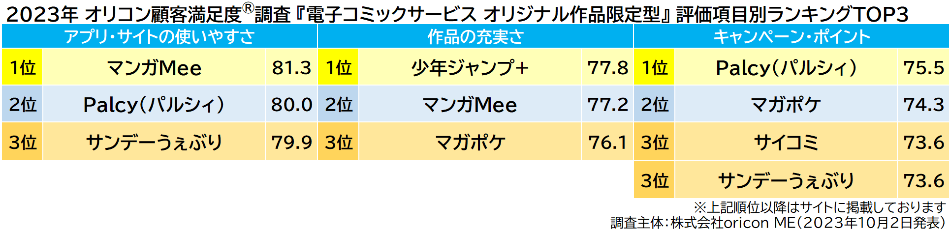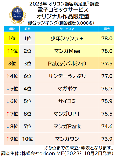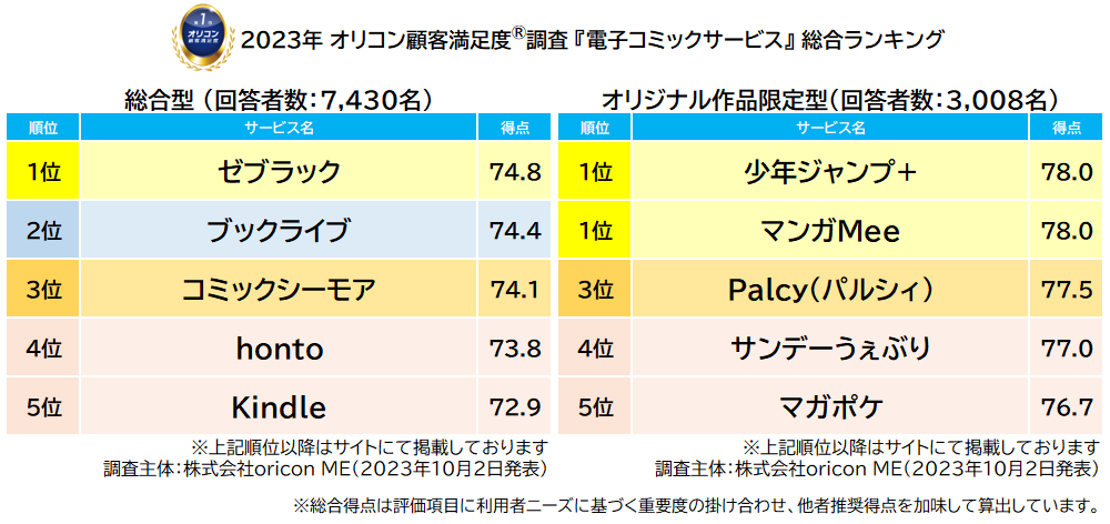 今回の調査では、集英社配信の【少年ジャンプ+】と【マンガMee】が同点で総合1位を獲得しました。