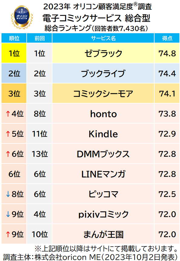 今回の調査では、集英社公式の総合電子書籍サービスである【ゼブラック(株式会社集英社 本社:東京都千代田区)】が昨年につづき、2年連続で満足度総合1位となりました。