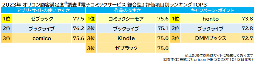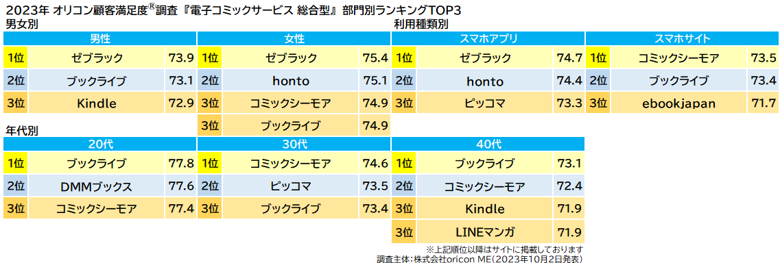 【ブックライブ】は「20代」部門で初の1位、【コミックシーモア】は「作品の充実さ」で4年連続1位に