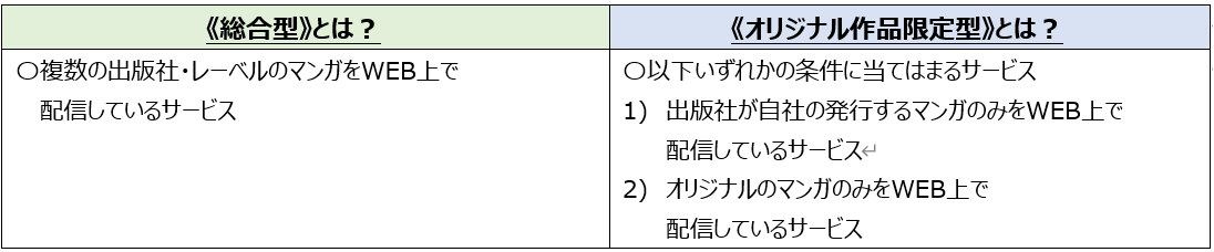 調査対象は、出版社が自社の発行するマンガのみをWEB上で配信している、もしくは、オリジナルのマンガのみをWEB上で配信している、のいずれかの電子コミックサービスとなります。