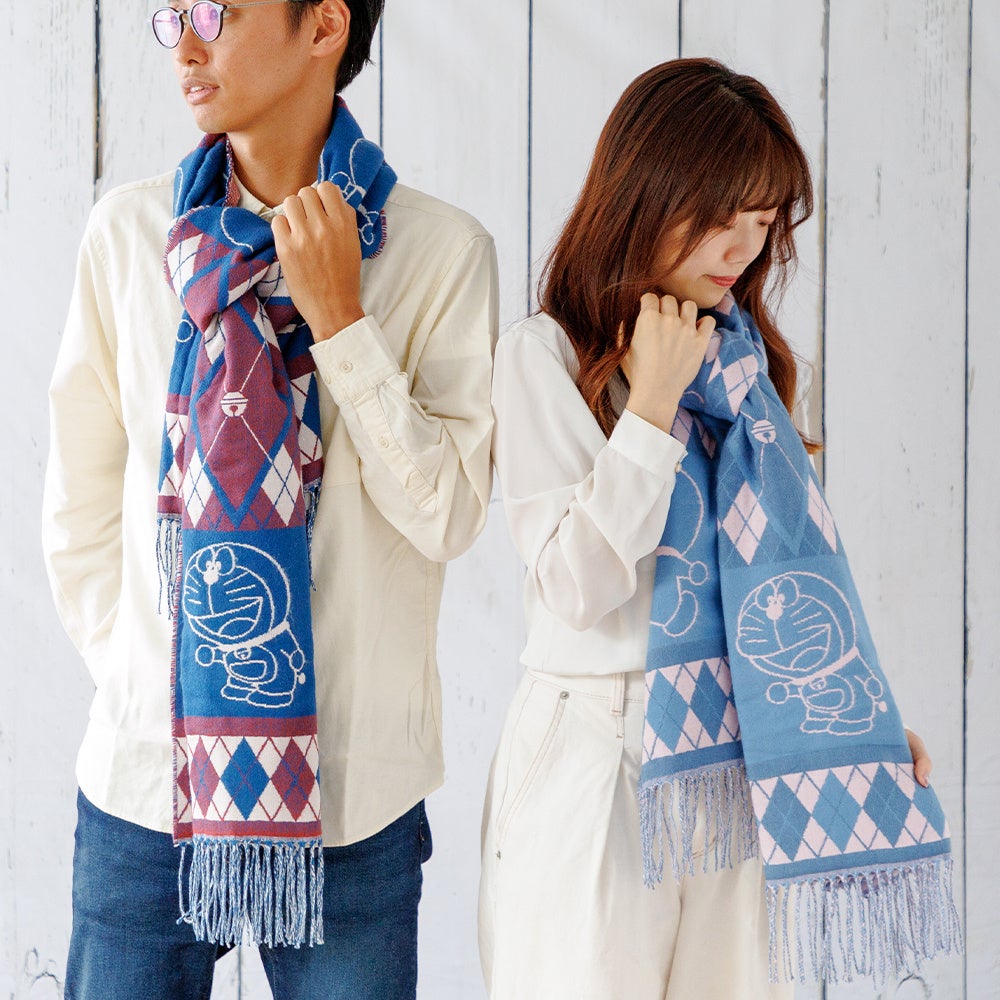 冬のストールやマフラーの定番のアーガイル柄に、ドラえもんのアートや鈴のアイコンを取り入れた、ドラえもん未来デパート限定のストールです。長さ180㎝と大判サイズで木製のボタン付きのため、マフラーとしてはもちろん、ボタンを留めてポンチョのように羽織ったり、ひざ掛けとしても重宝します。ユニセックスで着用しやすい、ボルドー×ネイビーとブルー×ピンクの2つのカラー展開です。肌寒くなるこれからの季節のアウターに取り入れてみてはいかがでしょうか。