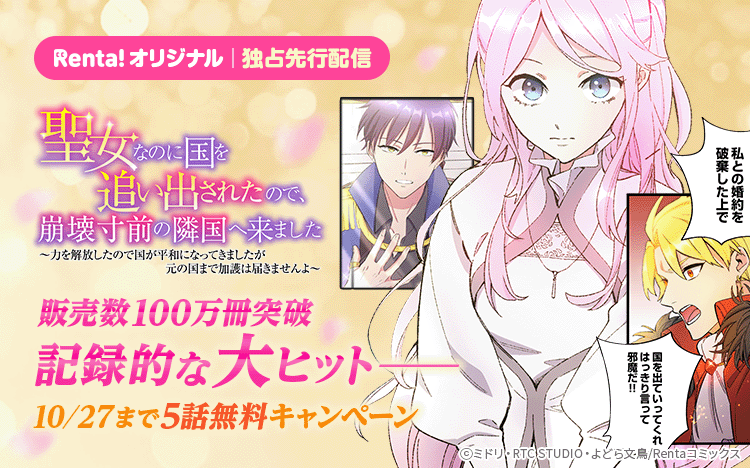 このたび、マルチデバイス対応電子書籍レンタルサイト「Renta!」(https://renta.papy.co.jp/)では、カラー縦スクロールのRenta!オリジナルコミック『聖女なのに国を追い出されたので、崩壊寸前の隣国へ来ました~力を解放したので国が平和になってきましたが元の国まで加護は届きませんよ~(以下、略称『聖女なのに~』)』が異例の速さで販売数100万冊を突破し、Renta!の2023年上半期の少女漫画ランキング・タテコミランキングで共に堂々の1位を獲得いたしました!