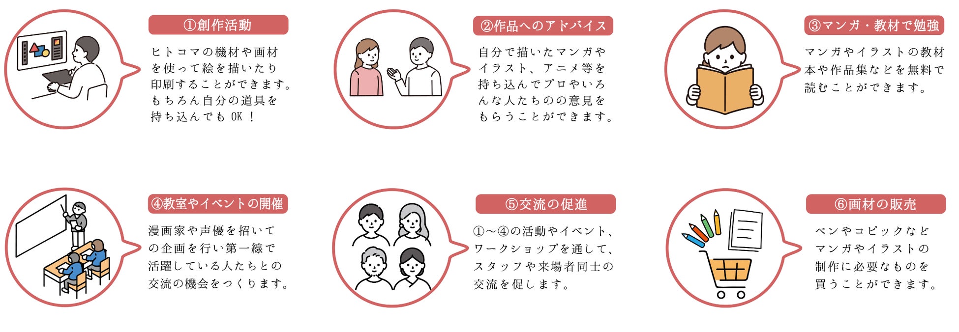 「マンガやアニメが好き」「イラストを描いてみたい」「声優になりたい」「興味はあるけど、どうすればいいのかわからない」という方々に、イベントやワークショップを通してマンガやアニメ等に〈触れる〉〈学ぶ〉機会をつくり、みなさんの初めの“ヒトコマ”のお手伝いをします。