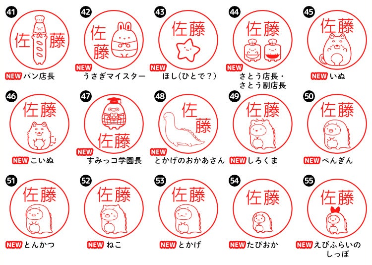 イラストはこちらの55種類。パン店長、うさぎマイスター、ほし(ひとで?)、さとう店長・さとう副店長、いぬ、こいぬ、すみっコ学園長といった新キャラクターに、とかげのおかあさん、きょうりゅうのきぐるみを着たすみっコたちなど総勢15種類があらたに登場しました。