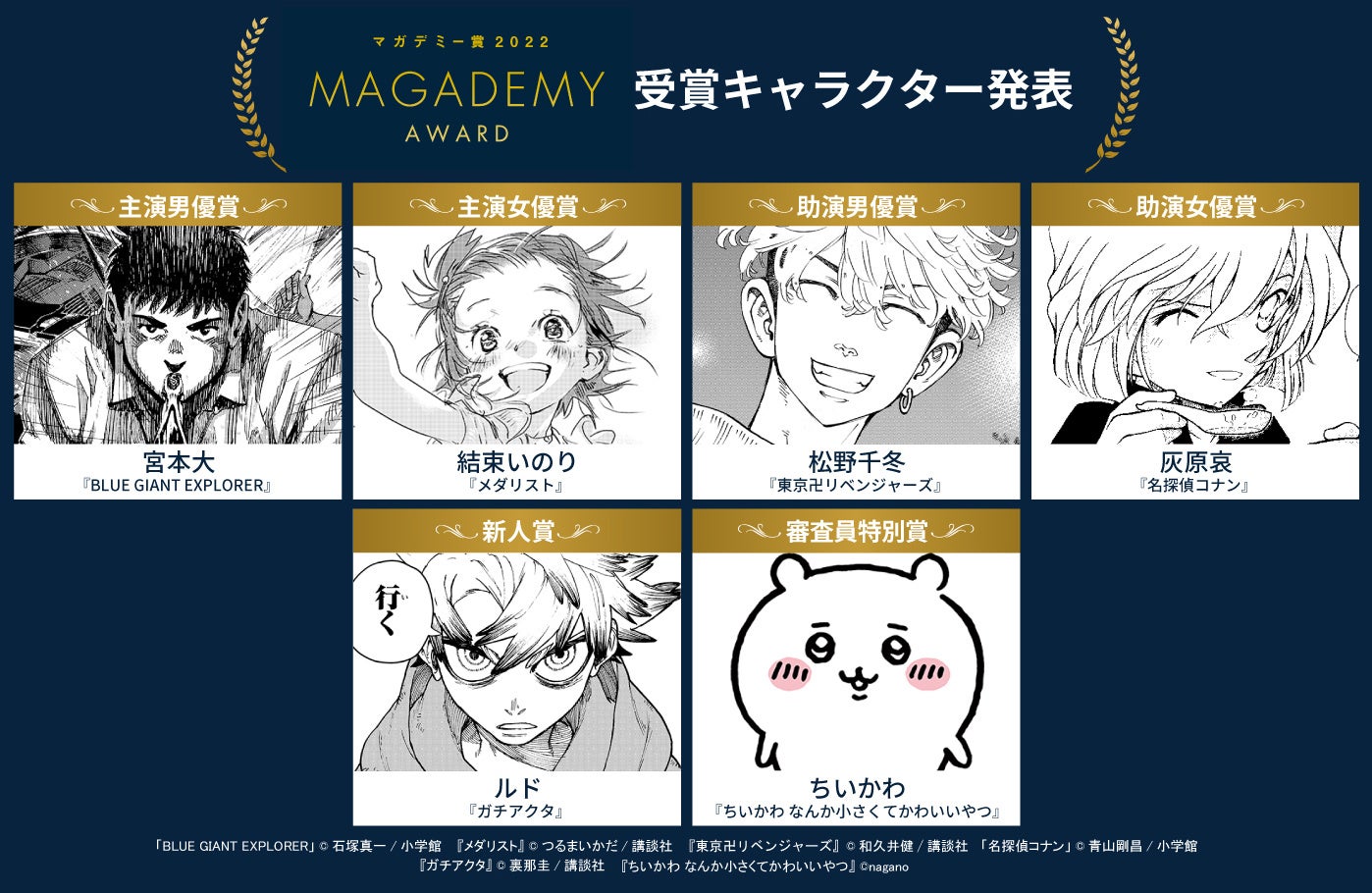 「マガデミー賞2022」では、2021とはまた違った”今”を表したキャラクターが受賞されました。「応援したくなる」というところがポイントだったかと思います。自分の信じた道を突き進む姿で感動させてくれた『BLUE GIANT EXPLORER』の宮本大さん、努力して進化していく姿に感動をくれた『メダリスト』の結束いのりさん、主人公である花垣武道さんの背中を守る姿に胸が熱くなった『東京卍リベンジャーズ』の松野千冬さん、主演級の人気を誇る『名探偵コナン』の灰原哀さんが受賞され、どの方も応援せずにはいられない!という方々だと思います。