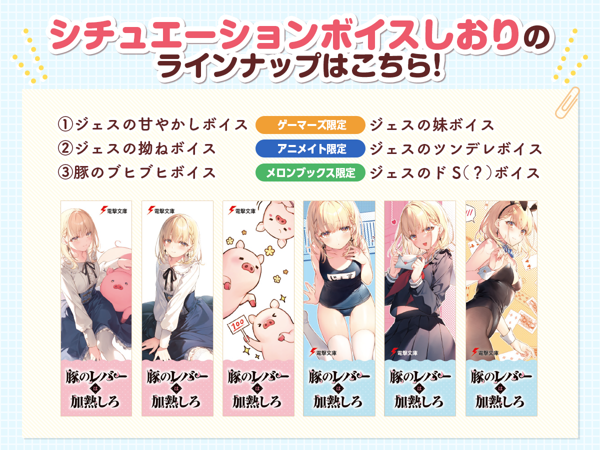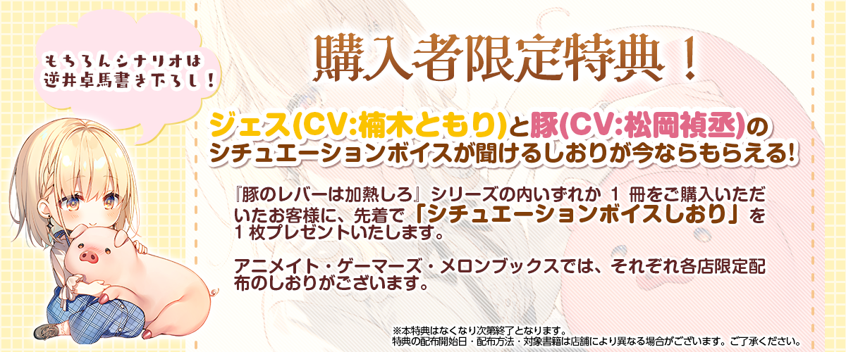書店にて『豚のレバーは加熱しろ』シリーズのうちいずれか1冊をご購入いただいたお客様に、先着でジェス(CV.楠木ともり)と豚(CV.松岡禎丞)の「シチュエーションボイスしおり」を配布いたします。