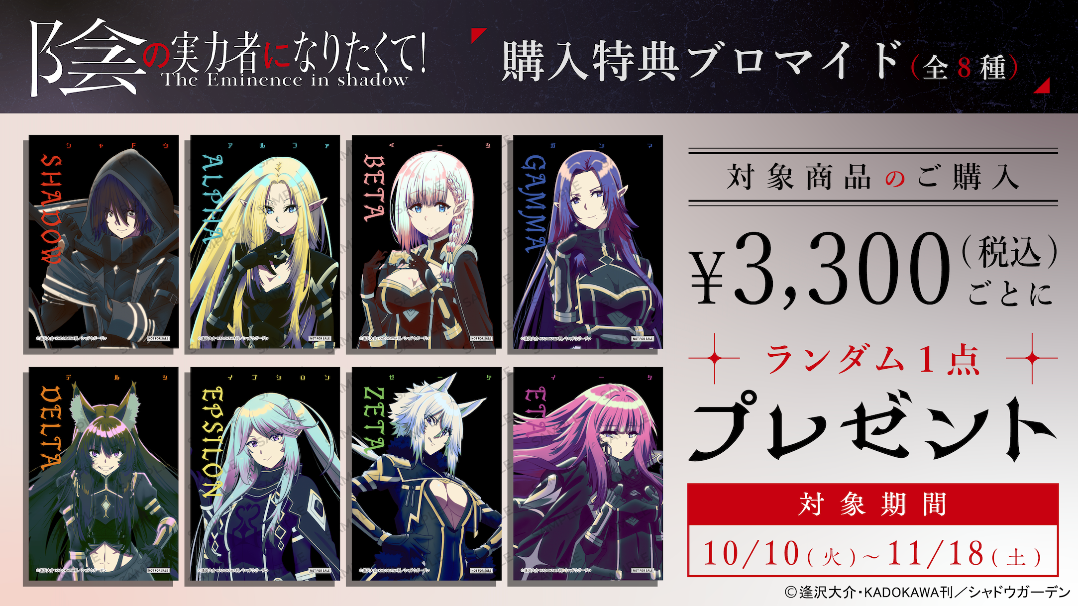 販売期間中(2023/10/10~11/18)、TVアニメ「陰の実力者になりたくて!」オリジナルグッズを3,300円(税込)お買い上げごとにランダムで購入特典ブロマイド(全8種)を1枚プレゼントいたします。