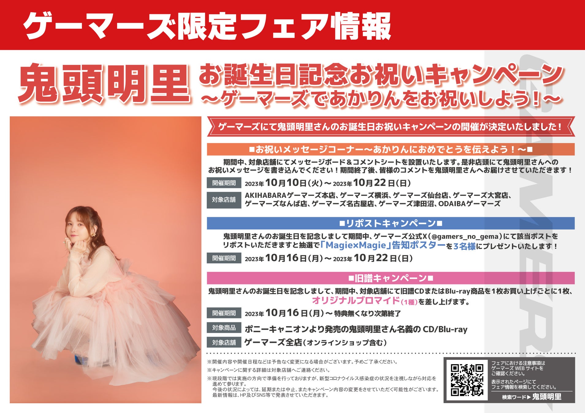 株式会社カードラボ ゲーマーズ(本社:東京都板橋区、https://www.gamers.co.jp/以下ゲーマーズ )は、2023年10月10日(火)より、【鬼頭明里さんお誕生日記念お祝いキャンペーン~ゲーマーズであかりんをお祝いしよう!~】を開催することをお知らせいたします。