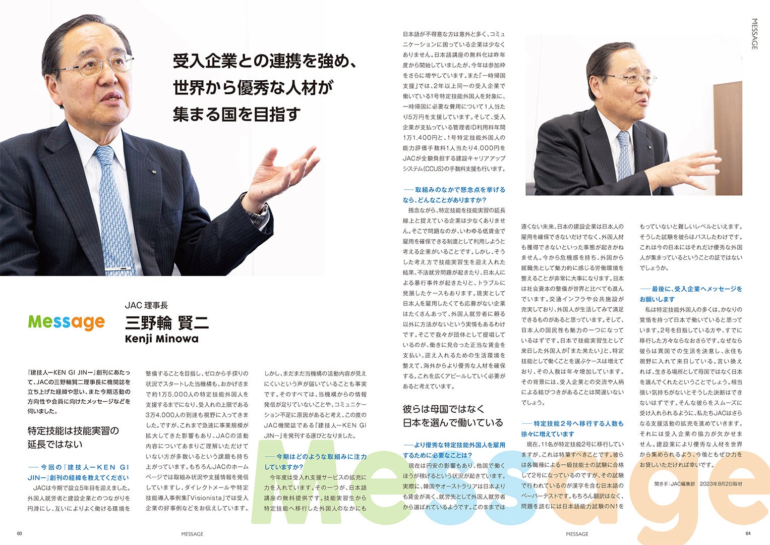 これまで急速に事業規模が拡大してきた影響もあり、まだまだ当機構の活動内容が見えにくいという声も届いています。そのため、会員の皆さまへの「ダイレクトメール」に加えて、JAC機関誌として『建技人ーKENGIJIN ー』を発刊する運びとなりました。