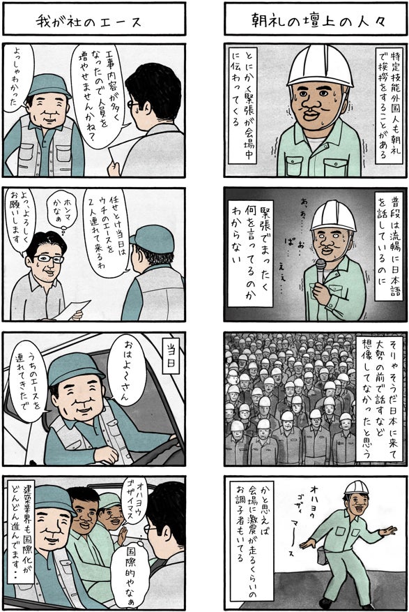 JACの機関誌『建技人-KEN GI JIN-』の1コーナーで、受入企業で働く日本人と外国人の日常をゆる〜く綴る漫画です。言葉の違い、文化の違い、笑いのツボの違い。いろいろあるけど、一緒に働いたらお互い笑顔になる瞬間はたくさんあるもの。そんな特定技能外国人との日々のちょっとした出来事を4コマでお届けします。