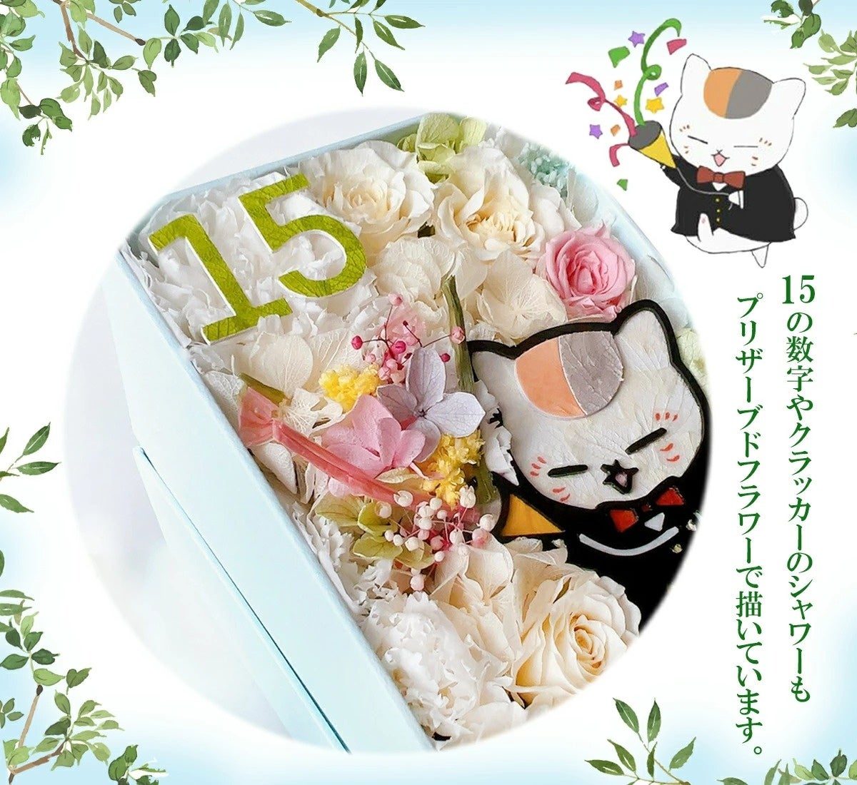 今回登場したフラワーBOXは、アニメ「夏目友人帳」の15周年を記念した特別なデザインのフラワーBOX。タキシード姿でクラッカーを鳴らし、みんなと一緒にアニメ15周年をお祝いするニャンコ先生をお花で描きました。
