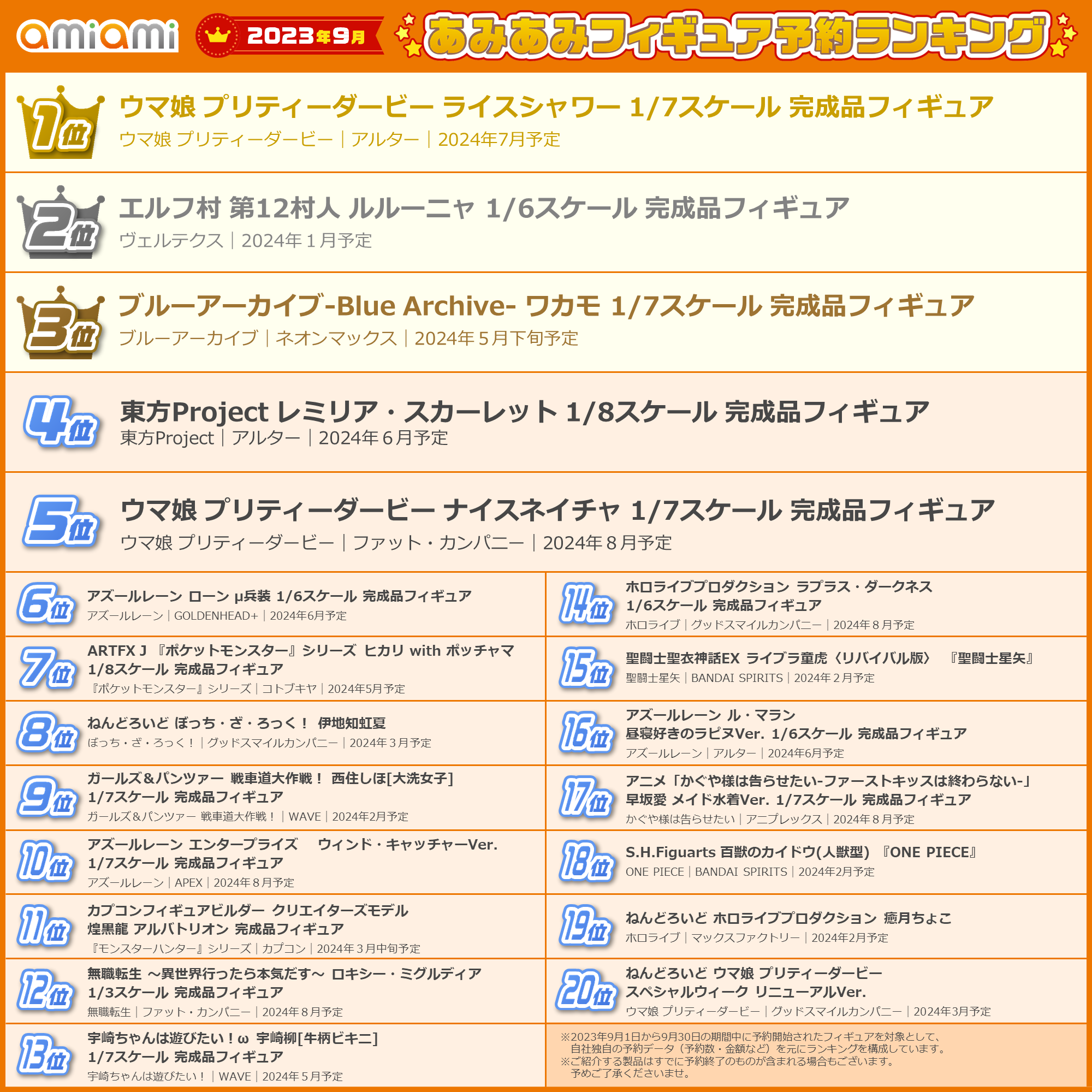ホビーショップ『あみあみ』の「2023年9月フィギュア予約ランキング」を発表!