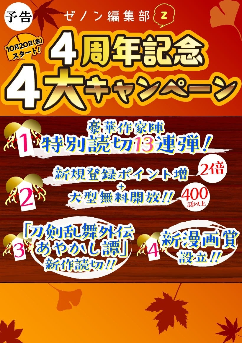 株式会社コアミックス(東京都武蔵野市)が運営するWEBゼノン編集部にて、10月20日より4周年記念4大キャンペーンを開催することが決定致しました。