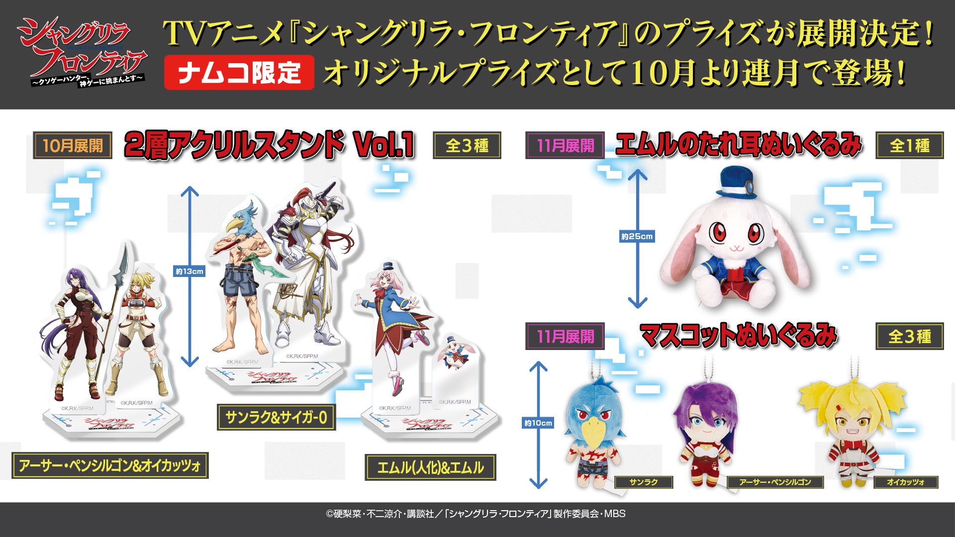 株式会社CyberZ(本社:東京都渋谷区、代表取締役社長:山内隆裕)の連結子会社、株式会社eStream(本社:東京都渋谷区、代表取締役社長:高井里菜)は、TVアニメ『シャングリラ・フロンティア』のオリジナルプライズ商品を2023年10月下旬より展開することを決定いたしました。「サンラク」、「サイガ-0」、「アーサー・ペンシルゴン」、「オイカッツォ」、「エムル」のイラストを使用したオリジナルプライズ商品をご用意し、株式会社バンダイナムコアミューズメントが運営する全国の直営アミューズメント施設「namco」、ネットクレーン「とるモ」にて順次展開いたします。
