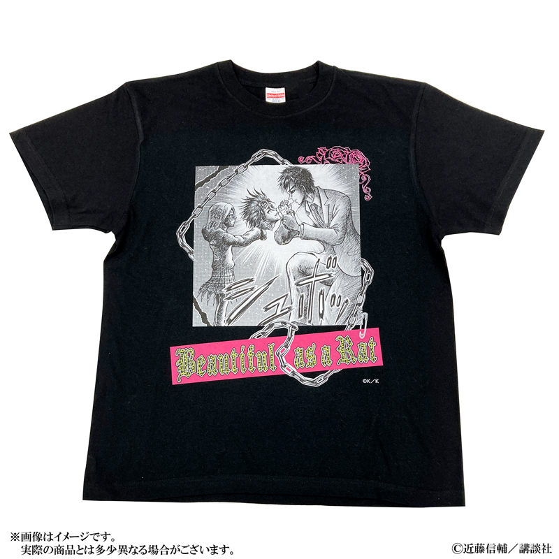 帝都高での戦い後、輝村極道が殺島飛露鬼を「ドブネズミみたいに美しい…!!!」と称えたあの有名なシーンをプリントしました。高揚(アガ)るデザインになっています。