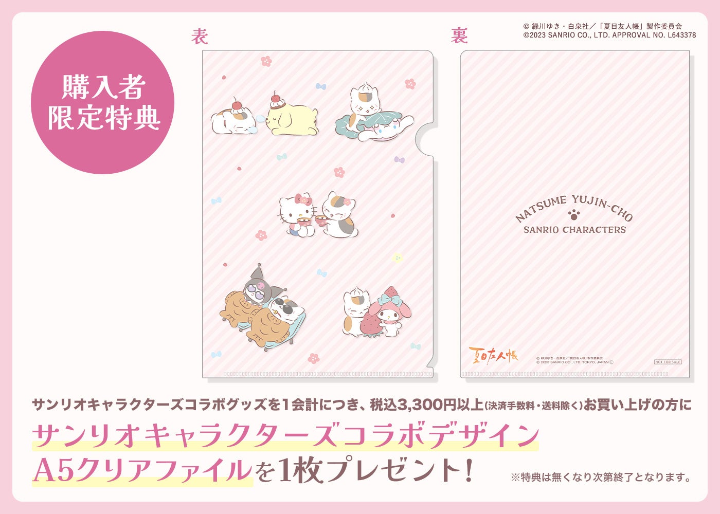 「夏目友人帳 アニメ公式オンラインストア」にてサンリオキャラクターズコラボ商品を税込3,300円以上お買い上げの方にA5クリアファイルを1枚プレゼントいたします。