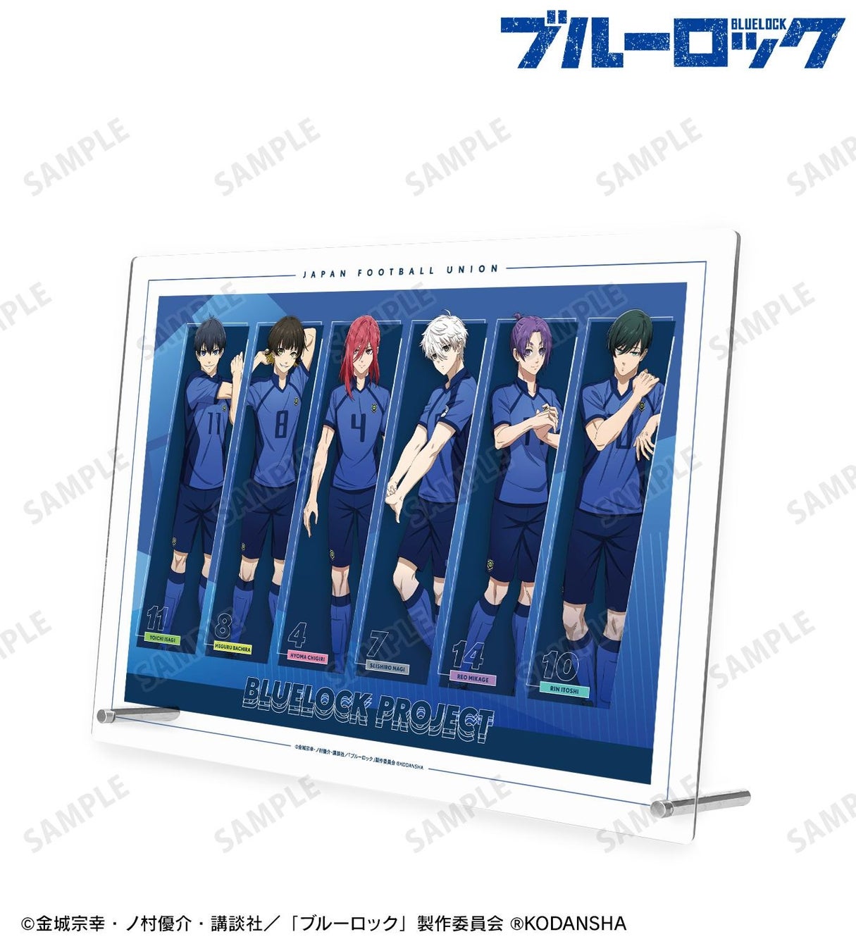 潔 世一、蜂楽 廻、千切 豹馬、凪 誠士郎、御影 玲王、糸師 凛の描き下ろしイラストをA4サイズのアクリルパネルに仕上げました。