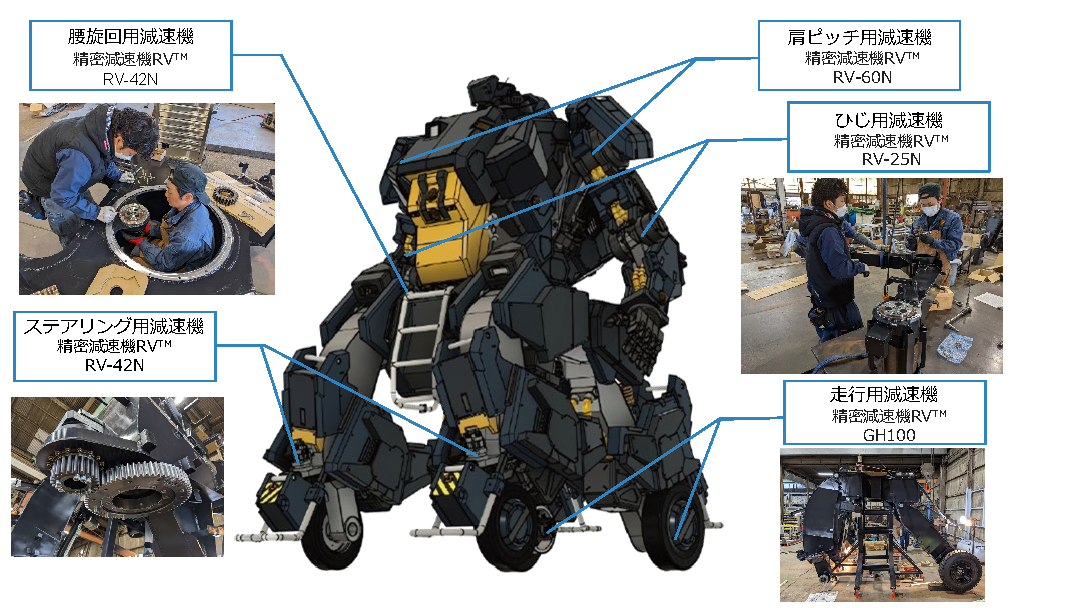 当社の主要事業である精密減速機RVは、モータの回転をトルクに変換し、躯体部分の振動の低減や精密な制御を可能にする装置で、主に可搬重量の大きい中大型産業用ロボットの間接用途に採用されています。『アーカックス』には腰旋回用や走行用をはじめとして、一機体あたり9つの精密減速機RVが搭載されており、そのスムーズで正確な動作を実現します。