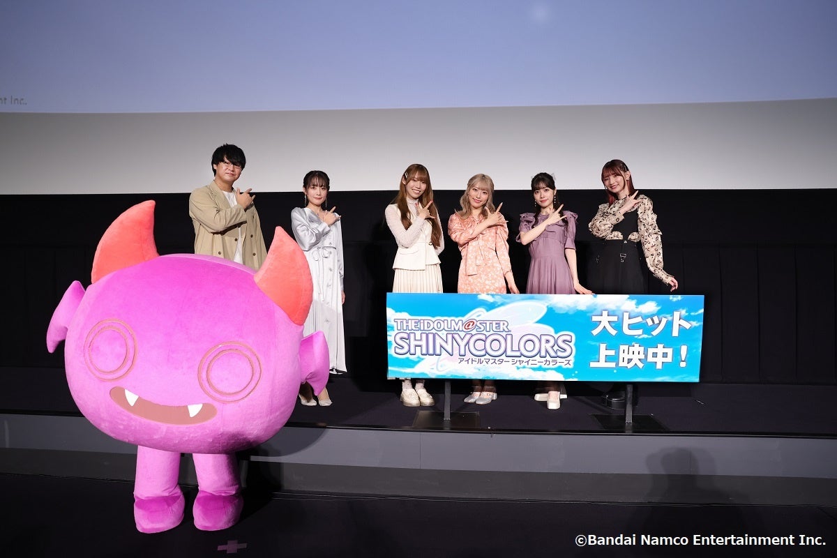 舞台挨拶には関根瞳さん(櫻木真乃役)、礒部花凜さん(月岡恋鐘役)、河野ひよりさん(小宮果穂役)、黒木ほの香さん(大崎甘奈役)のキャスト4名、さらにMCとして高山祐介さん(「シャイニーカラーズ」プロデューサー)、池田ななこさん(アニメ「アイドルマスター シャイニーカラーズ」プロデューサー)のスタッフ2名が登壇し本作への思いを語った。(以下敬称略)