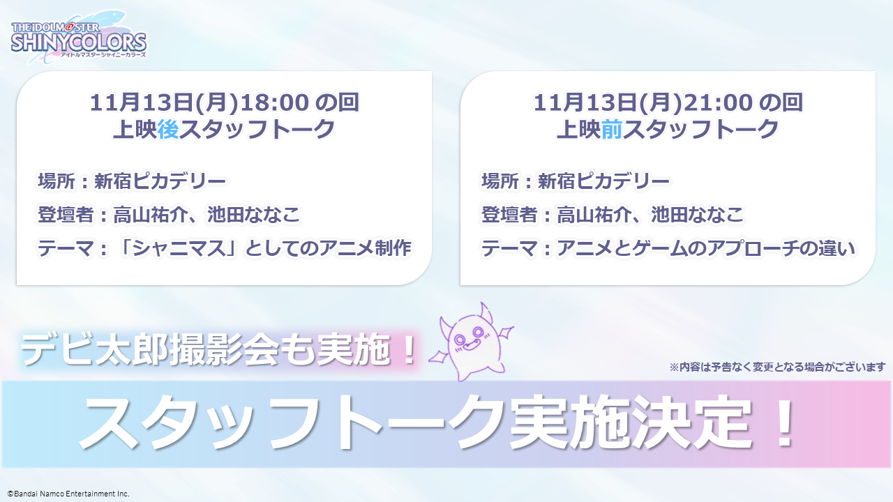 ①18:00の回 上映後(20:30頃終了予定) テーマ:「シャニマス」としてのアニメ制作