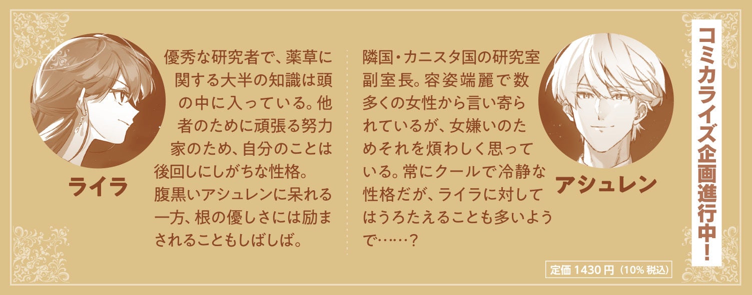 ジルギスタ国の薬草研究者であるライラは、同じ研究所の婚約者や妹に「雑用係」と罵られ、重ねた努力を誰からも認められない日々を過ごしていた。挙句の果てには婚約破棄まで言い渡され、研究所を去ることを決意したライラ。そんな時、隣国で研究者をしているというアシュレンに出会う。「ここで愛を囁けばロマンティックなのだろうが、俺は貴女をスカウトしに来た」その誘いに希望を見出し、アシュレンの研究仲間として隣国に渡ったライラ。そこで充実した日々を過ごすうちに、二人の心は変化し始め――?︎