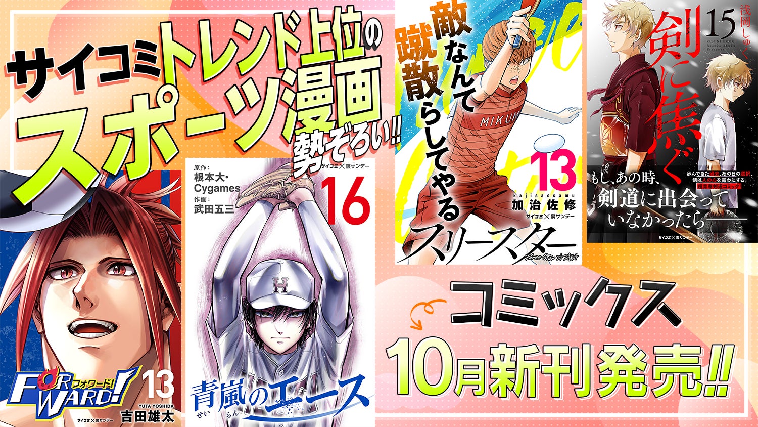 最強ストライカーと男子高校生の数奇な運命を描いた『Forward!-フォワード!-』、手負いのエースが再起を誓い、甲子園を目指す本格野球マンガ『青嵐のエース』、「鬼子」と呼ばれた少年が、奥深き剣の道を歩む『剣に焦ぐ』、王道“じゃない“異色の卓球ドラマ『スリースター』は、「サイコミ」にて長期連載中で、いずれもトレンド上位のオリジナルスポーツ漫画です。