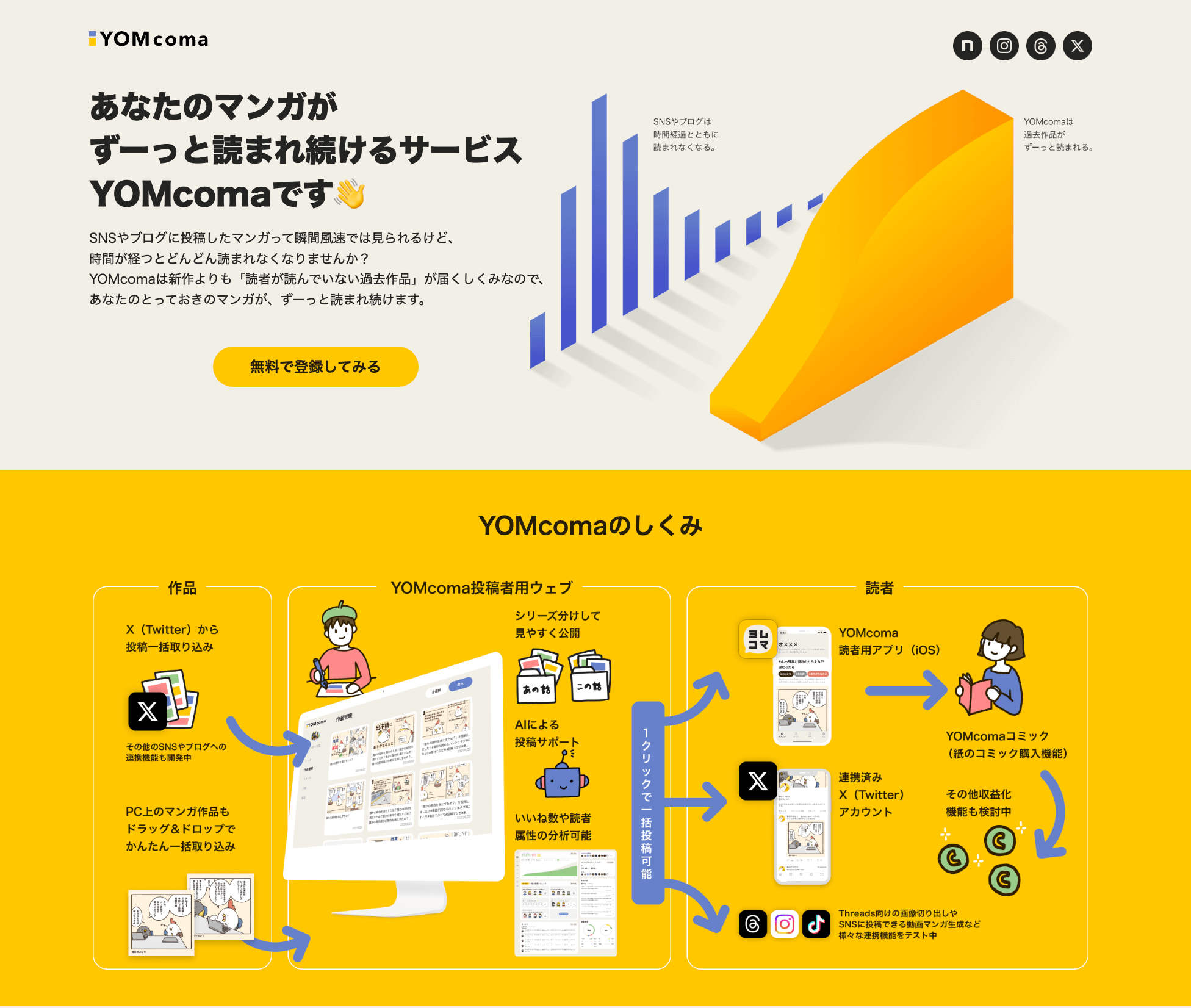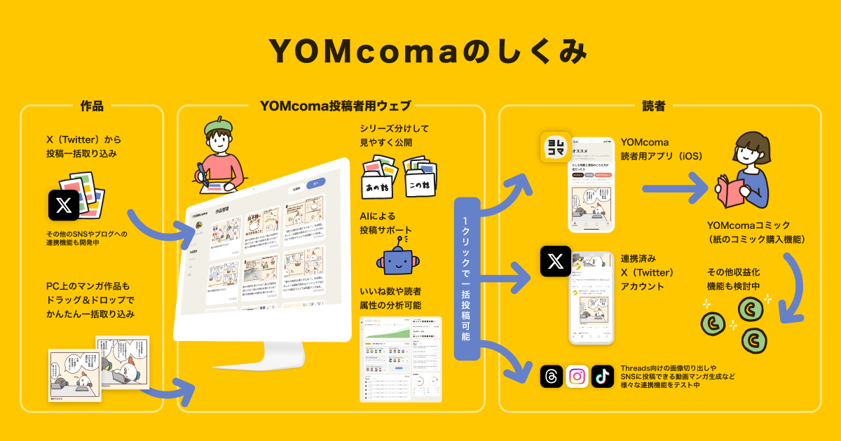 「YOMcoma」は、これまでX(旧:Twitter)でショートマンガを投稿するクリエイターのサポートツールとして、Xへの予約投稿機能や、Xからの一括取り込み機能などを提供してきました。