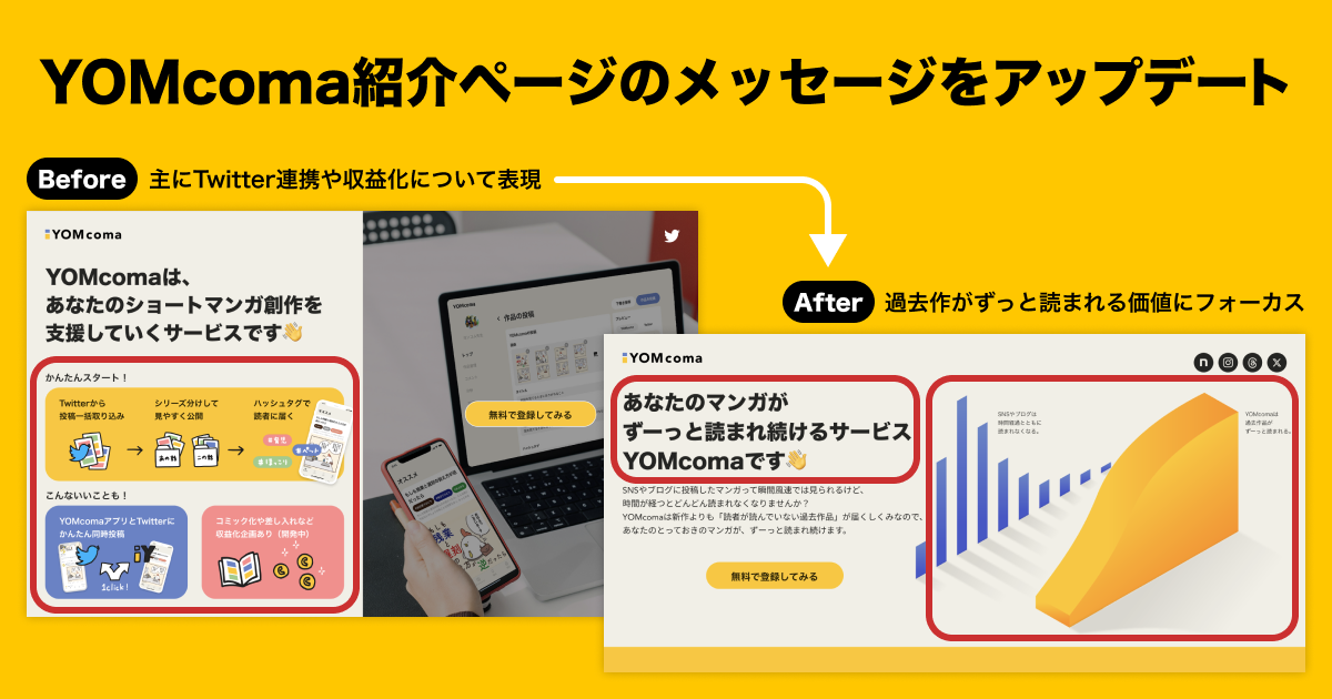 今後は、Xに限らず、ブログサービス、Instagram、TikTok、YouTubeなど、様々な場でショートマンガを見てもらいたいクリエイターの創作活動を支援するため、過去作品がずっと読まれ続けるプラットフォームとして価値提供を目指していきます。「YOMcoma」は、通常のSNSやブログと大きく異なり、マンガを新着順で表示するよりも、「その読者にとっての未読作品」を優先的に表示し続ける仕組みになっています。これにより、既存のSNSやアプリでは時間経過とともに読まれなくなってしまった「過去作品」が、「YOMcoma」の中では多くの読者にずっと読まれ続けることが可能になります。