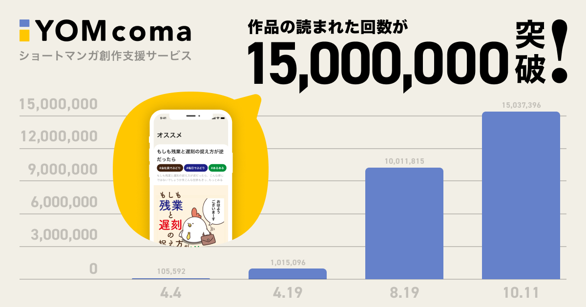 「YOMcoma」は、β版のリリースから約5ヵ月間で、投稿者の作品を読まれた回数が合計1,500万件を突破いたしました。