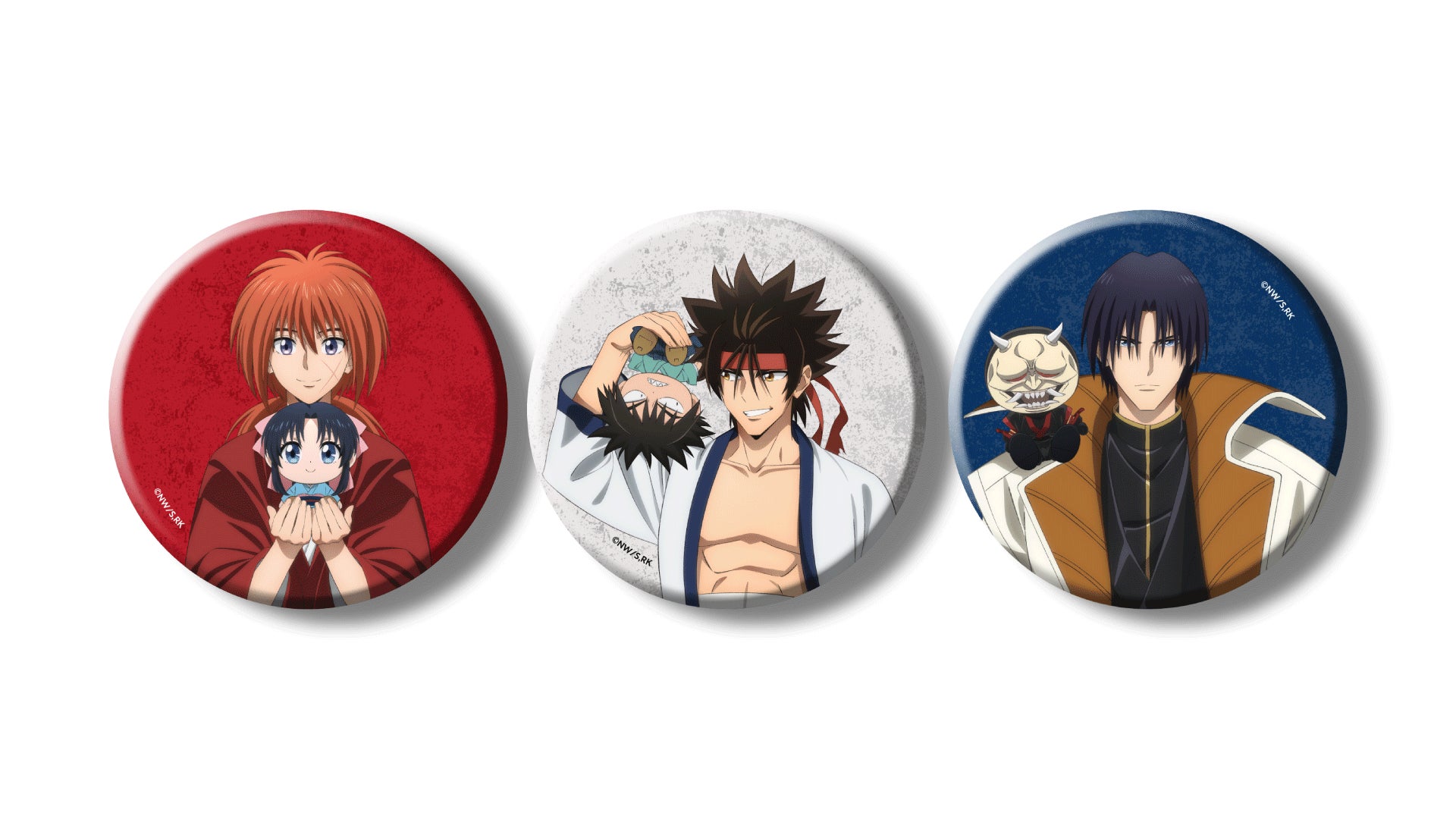 TVアニメ『るろうに剣心 -明治剣客浪漫譚-』から「緋村剣心」「相楽左之助」「四乃森蒼紫」たちが、それぞれ「神谷薫」、「明神弥彦」、「般若」の可愛いぬいぐるみを抱えたイラストになっています。