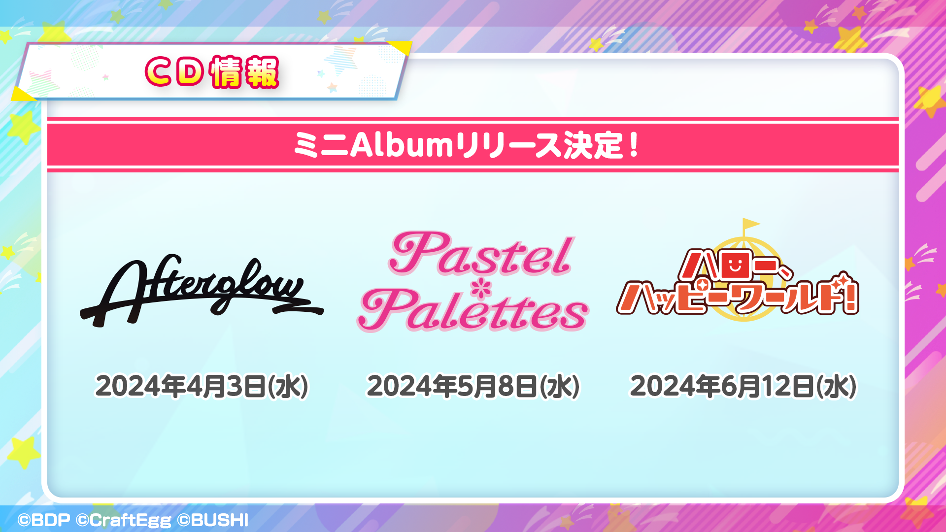 2024年4月~6月にかけて、Afterglow、Pastel*Palettes、ハロー、ハッピーワールド!のミニAlbumの連続リリースが決定しました。