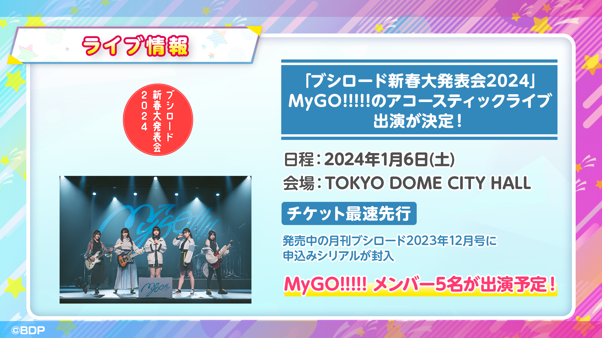 2024年1月6日(土)開催予定「ブシロード新春大発表会2024」にMyGO!!!!!のアコースティックライブ出演が決定しました。