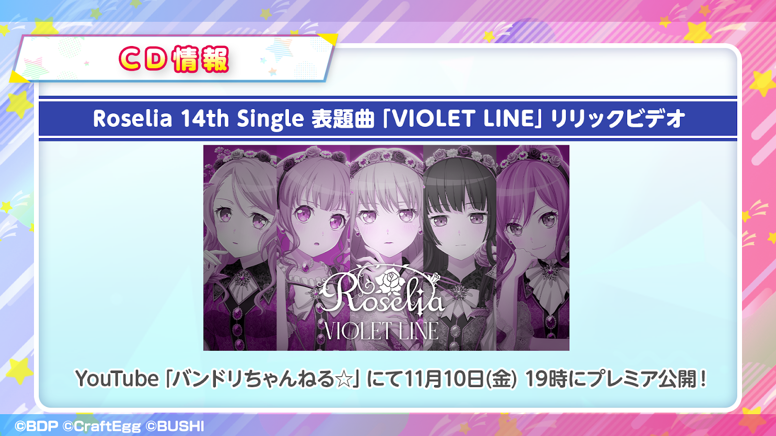 2023年12月13日(水)リリース Roselia 14th Singleの表題曲「VIOLET LINE」のリリックビデオを、11月10日(金)19時にYouTube「バンドリちゃんねる☆」にてプレミア公開いたします。