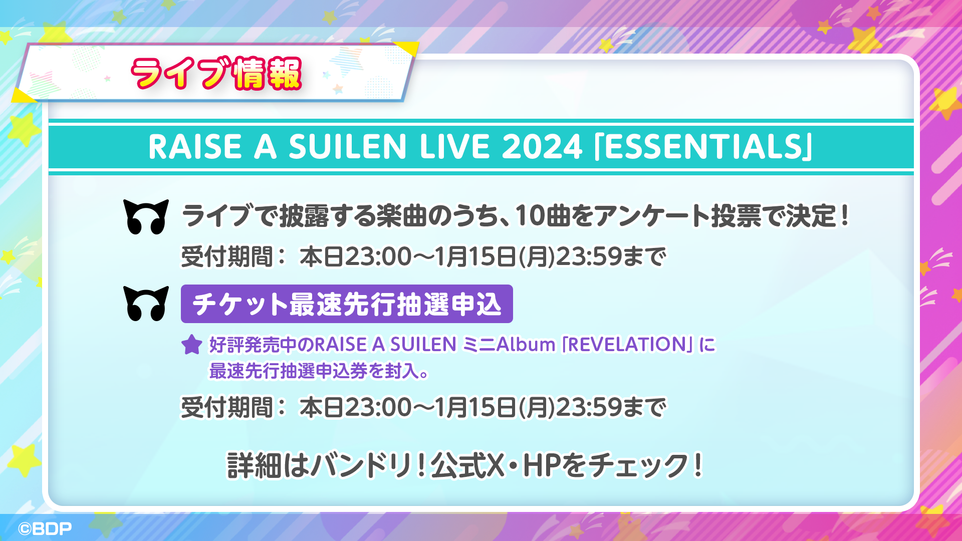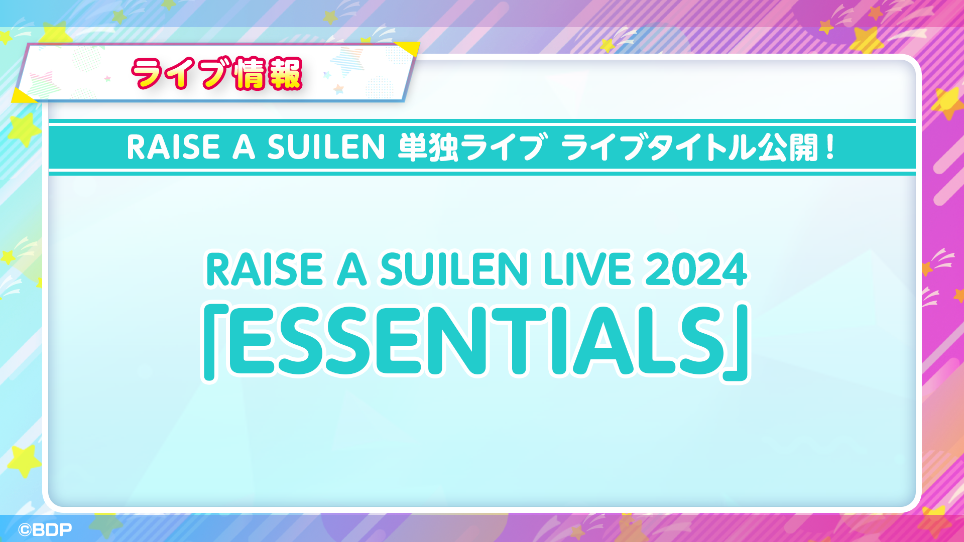 2023年6月15日(土)・16日(日)に開催が発表されていたRAISE A SUILEN単独ライブのタイトルが、RAISE A SUILEN LIVE 2024「ESSENTIALS」に決定いたしました。