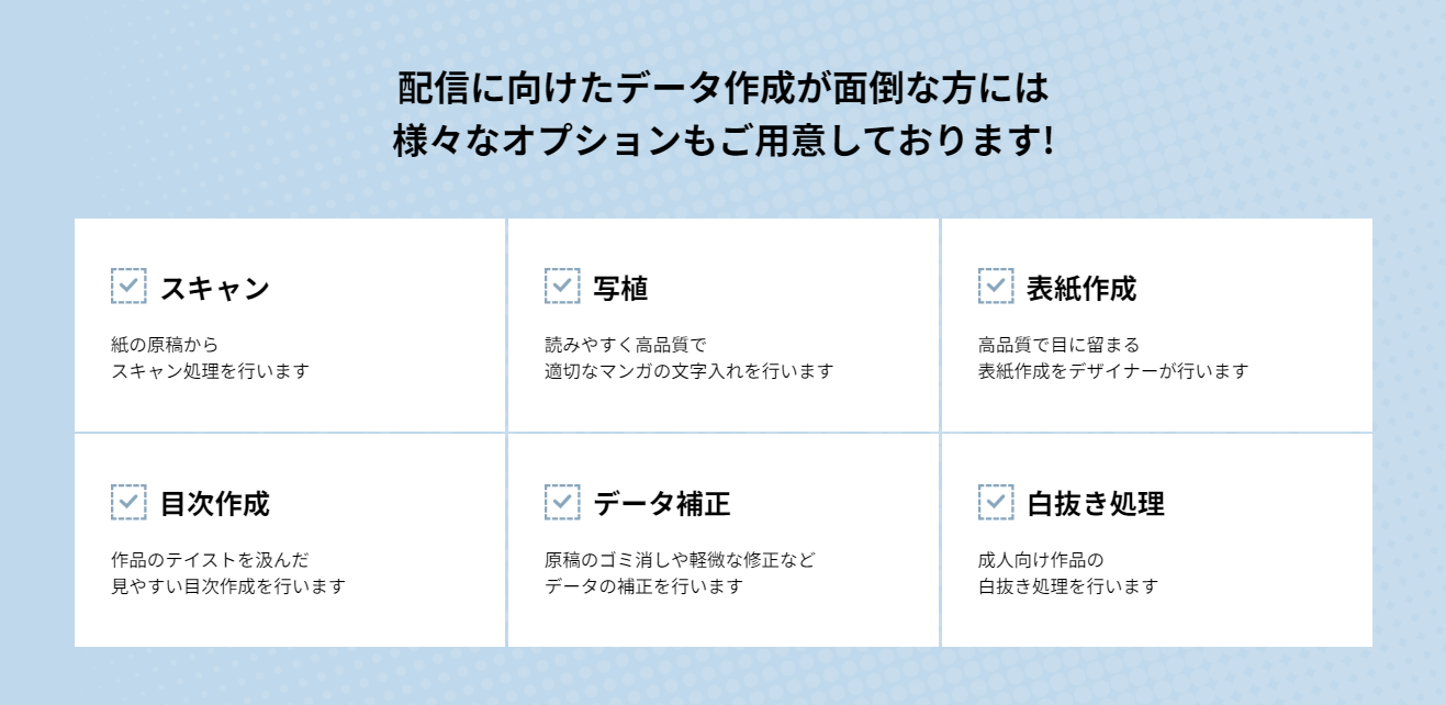お手持ちの作品を電子書籍ストアに配信するサービスです。
